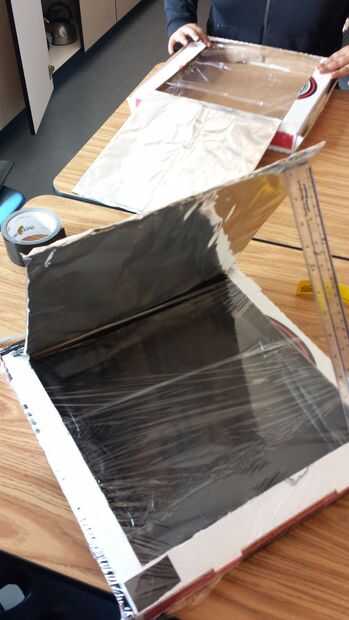 Hornos solares utilizan los rayos uv del sol para calentar el objeto. Esto ocurre porque los rayos UV se reflejan del aluminio y en la caja. En el cuadro tenemos papel negro para absorber creando calor, papel negro es el mejor para la absorción de ca