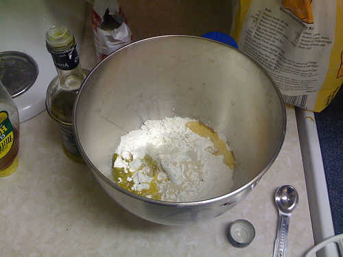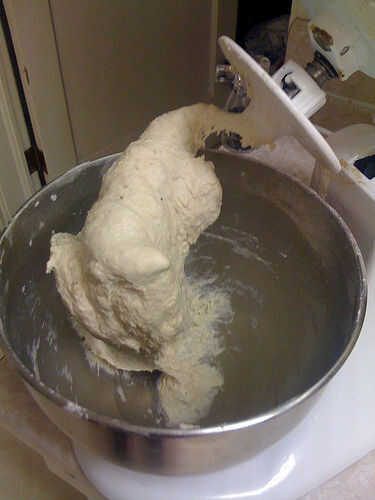 Coloque el gancho para amasar y batir la masa, lentamente al principio para que la harina no vuela para arriba en su cara. Cuando toda la harina se incorpora, suba la velocidad. Bate la masa hasta que acurruca en un poco de bola y gemidos.