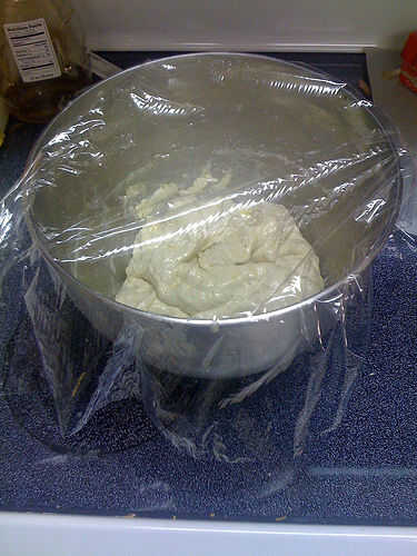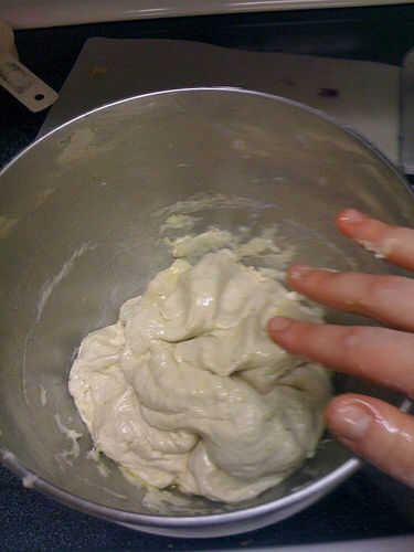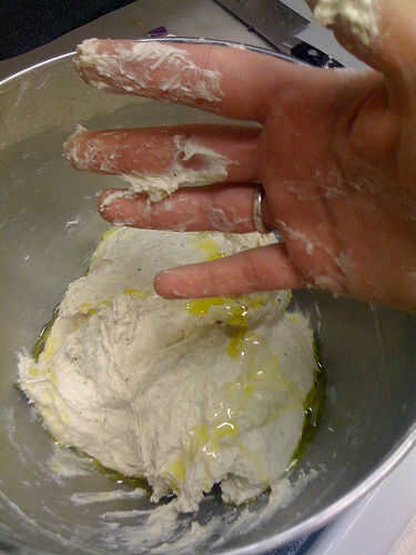 La masa se pegue en el gancho para masa como usted tire. Raspar el gancho y retire el recipiente de la batidora. Llovizna en aceite de oliva, raspar la masa de los lados del tazón de fuente y rodar para cubrir con aceite. Cubra el tazón con envoltura de plástico y colóquelo en la nevera al menos durante la noche.