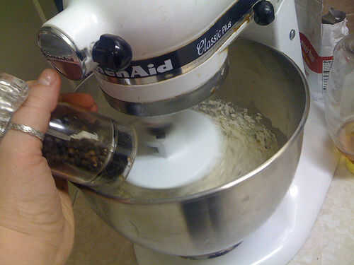 3 tazas de harina en el recipiente de una batidora de la descarga. Añadir la sal, miel, aceite y levadura. Agregue el agua. Siempre y cuando sabes que la levadura está viva (si ha tenido éxito en otras recetas), no es necesario molestar a lo de la prueba. Moler en la pimienta negra. Pimienta negra es buena en la masa de pizza.