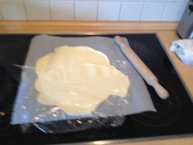 Masa libre de gluten es muy pegajosa. Después de la mezcla para corregir la consistencia (ver pic) lugar masa de horno o papel de hornear de silicona. Después cubrir con film transparente para aplanar hacia fuera sin hacer las manos y todo lo más bruto.