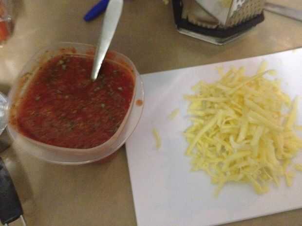 Tomar una lata de 15 oz de salsa de tomate triturado llano y añadir 1 cucharadita de orégano y mezclar. Difundir media la lata en la corteza y guardar la otra mitad para pizza algo más, o un segundo.