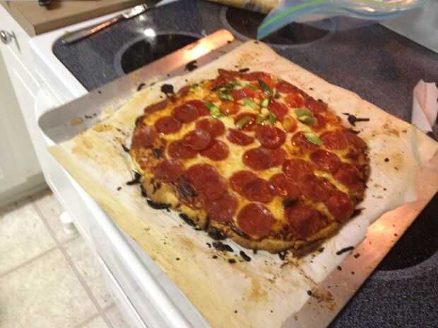 Hornear 15-20 minutos, pero mina generalmente tomar un 20 completo. Los bordes pueden dorar más de lo que desea, pero que tiende a ser vida con GF horneado. Una opción es cubrir los bordes de la pizza con papel de aluminio después de 10 minutos para tratar de impedir demasiado dorado en los bordes, pero me gusta la corteza más crujiente y odio desperdiciar papel, así que simplemente dejé que marrón.