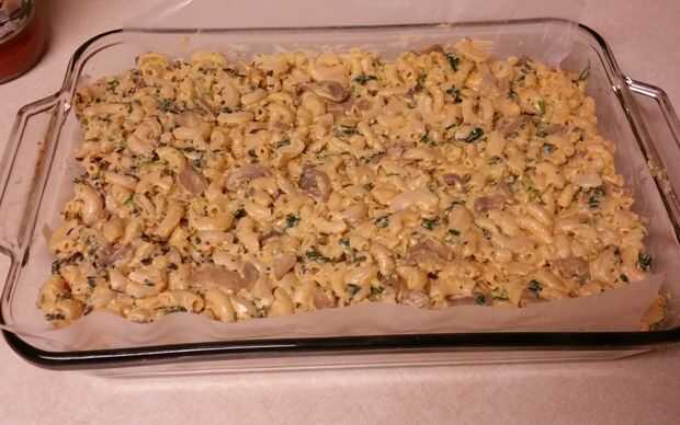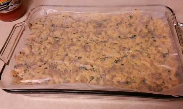 Antes de empezar, línea de una fuente para horno con papel de cera o de pergamino. Quieres tus macarrones que 1-2 pulgadas de espesor en la bandeja, para que un tamaño general puede ser 8 x 8 pulgadas pan de 1 caja - o un molde de 9 x 13 pulgadas para 2 cajas