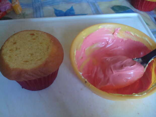 Para hacer la base de la pizza, simplemente mezcla tu blanco glaseado con gel colorante de rojo alimentos para crear una salsa de tomate picantes y helada de la Magdalena.