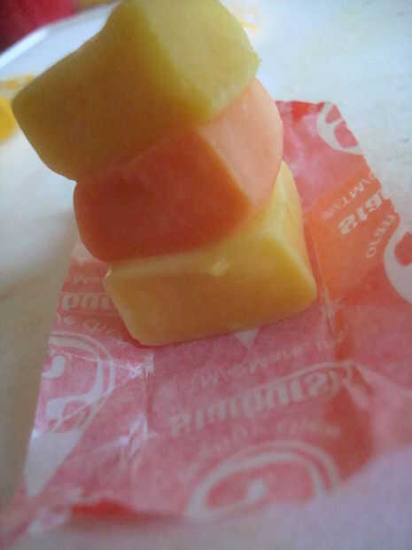 Para hacer la corteza comenzó con dos starburst amarillo con un starburst naranja en el microondas durante 10-15 segundo, mantenga sus ojos en él para que no se queme.