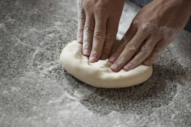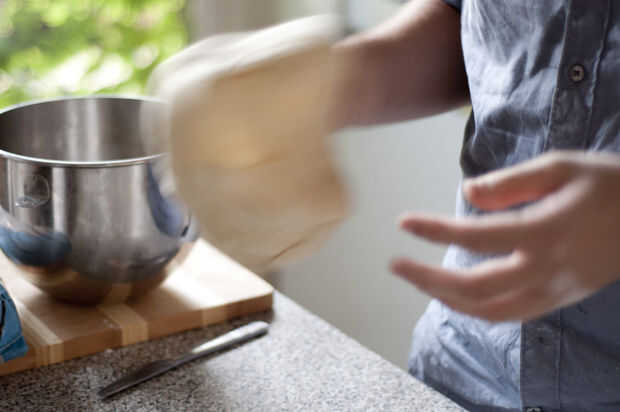Después de formar la masa en una bola, comienzan a pulsar hacia fuera sobre la superficie enharinada. Tomará un poco de spinning, insistencia y empuje, pero finalmente se llega a un estado donde puede levantarla y comenzar a estirarla ligeramente y dejarla colgar de las manos. Cuando se comienza a ensanchar un poco, estás listo para tirar suavemente en un movimiento circular. El truco es tratar de coger la masa con las manos en forma de puño. Si usted hace un todo, no es gran cosa, apenas junte la masa nuevamente y vuelva a intentarlo.