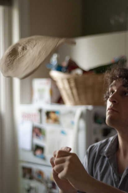 Lanzando con la mano no es sólo para mostrar; hay una lógica a la misma. Lentamente empujando la masa en un círculo más grande, estirando con la mano y lanzando, está creando un poco de gradiente horizontal grueso. Por lanzamiento, terminarás con un centro que es fina y crujiente y una corteza que masa un poco extra.