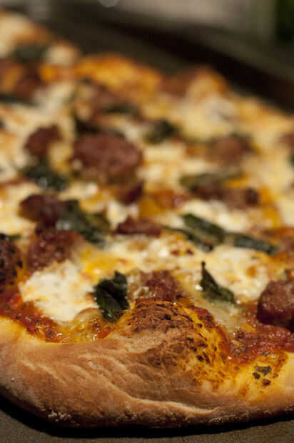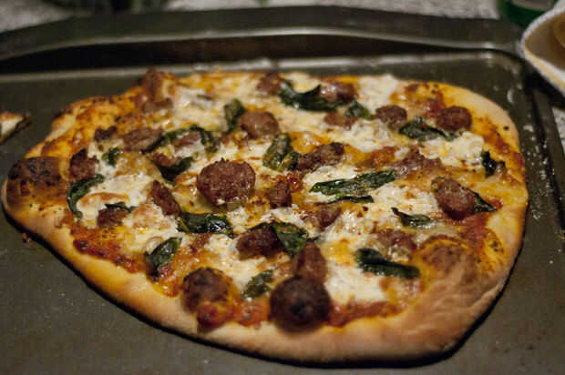 Con mi segunda pizza desde la masa restante, que hizo la misma base pero añade salchicha cocida y un poco de queso fontina.