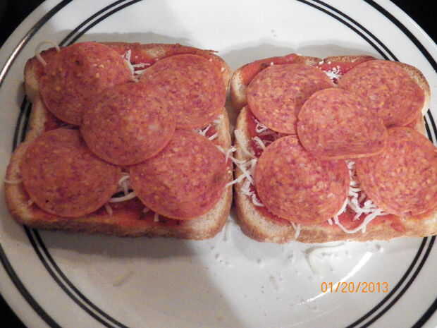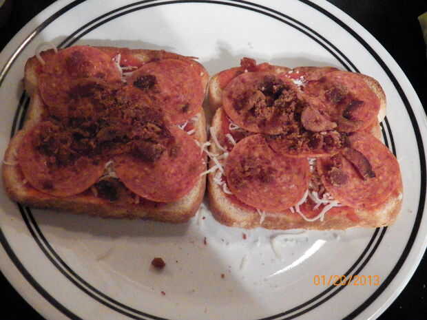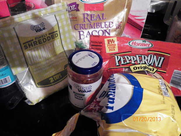 Utilicé queso rallada a la italiana (comencé utilizando una mezcla de mexicana, todavía estaba bastante bueno), Pepperoni, tocino y recientemente actualizado de salsa de tomate con cebolla en polvo (no golpearlo hasta que lo pruebes) a la salsa de pizza, porque eso es todo lo que tengo en mano, usted puede hacer suya con cualquier tipo de cubierta que desea! También sería una buena idea utilizar papel de pergamino, s la parte inferior se puede conseguir un poco empapada de lo contrario, pero es aún sabroso