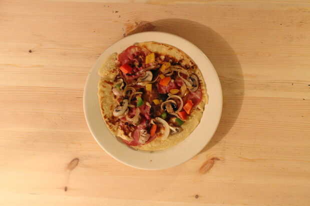 Cuando la masa esté aún húmeda pone en algunos de los sindicatos, pimentón y champiñones.
