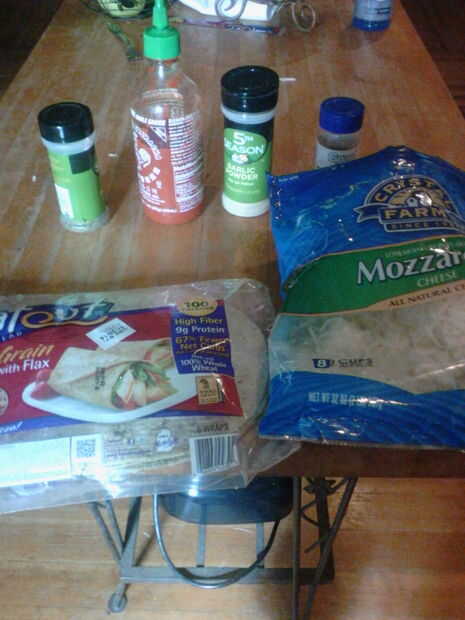 salsa siracha, ajo en polvo, orégano, aderezo italiano, pan plano cosas, queso mozzarella