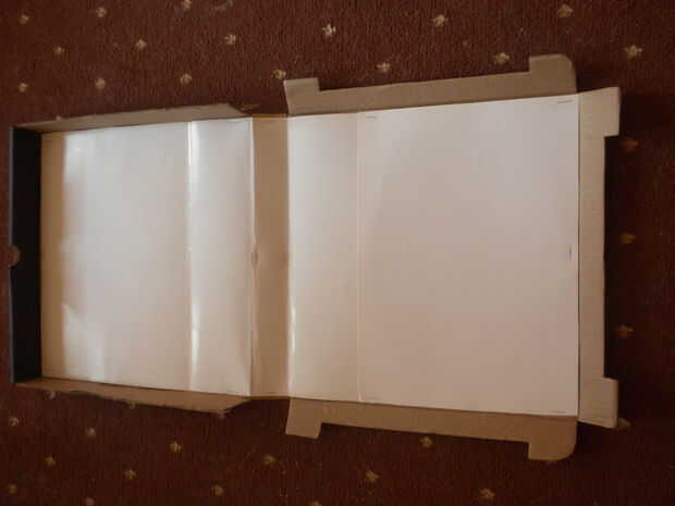 Ahora toma el papel de la cartulina blanco y abrir la caja de la pizza. Pegar la cartulina blanca en el interior de la caja de la pizza.