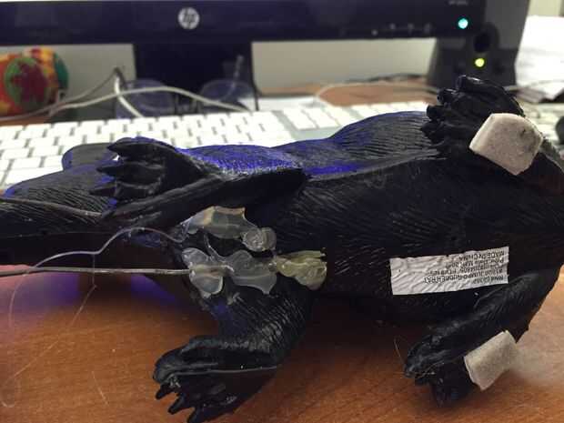 Caliente pegué los extremos de 2 pedazos de cable bastante rígido en la parte superior de la madera y los otros extremos que fijado a la parte inferior de la rata con pegamento caliente y un par de tornillos pequeños.