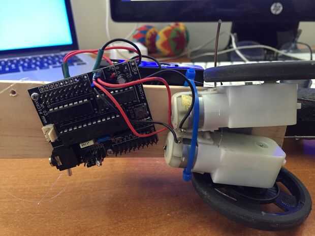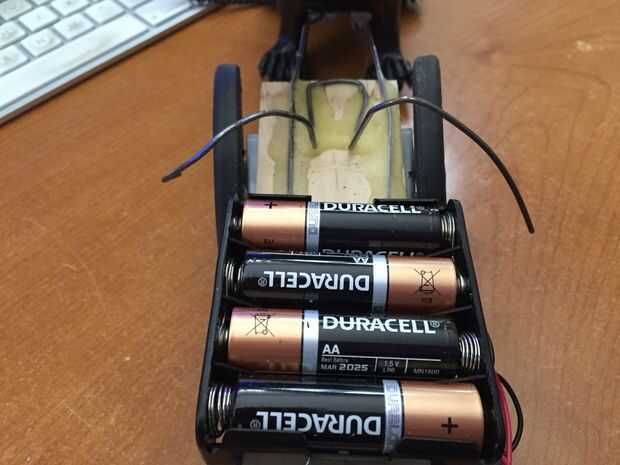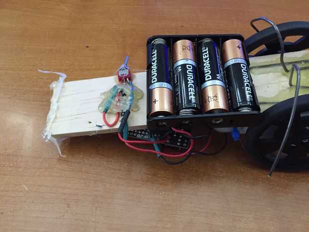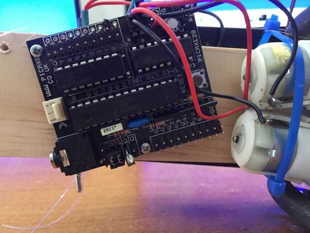 Así que usando un pequeño pedazo de 6 pulgadas de madera, os adjunto el soporte de la batería a un lado y el PIcaxe al otro. He conectado los motores con cinta de doble cara y utiliza una amarra para mantener aún más en su lugar.