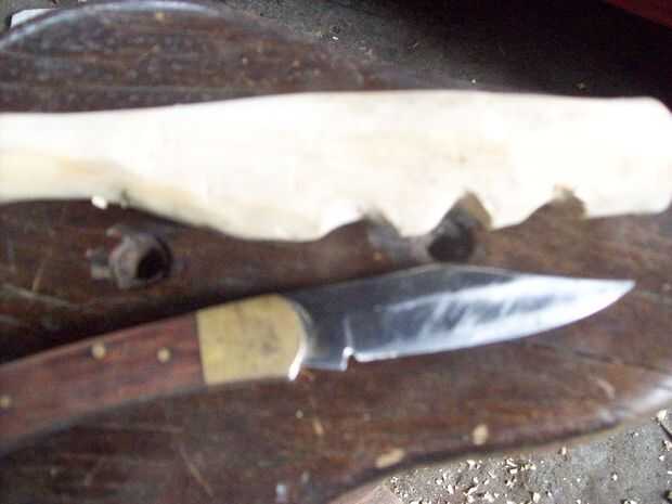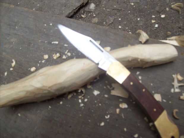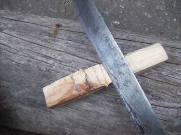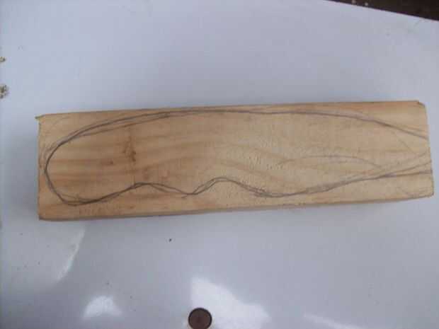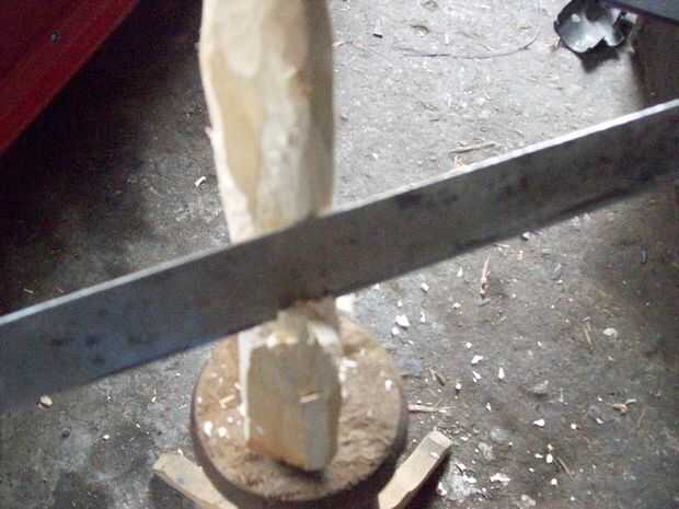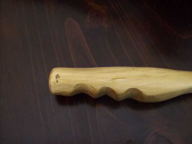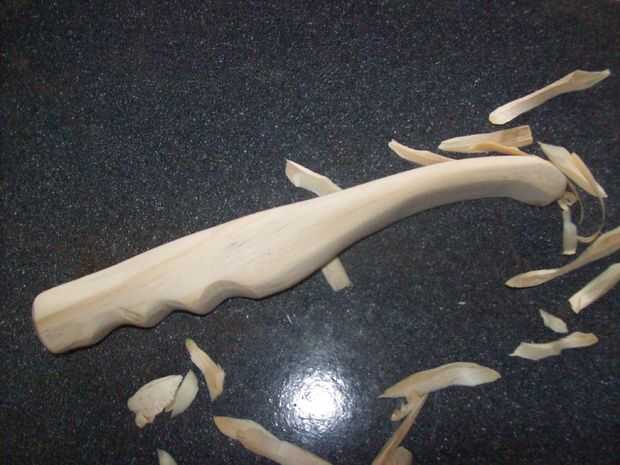 Encontre un buen pedazo de madera, y para ser honesto no me tomé el trabajo de dibujar un diseño, simplemente empeze a tallar con mi viejo machete y a medida la madera iba mostrando su linda forma yo iba tratando de darle una forma ergonomica, una vez tenia su forma basica empece a detallarlo con mi navaja de Bolsillo , a la de cariño le llamo Mikaela, lleva 25 años en la familia y la adoro.