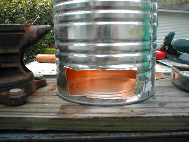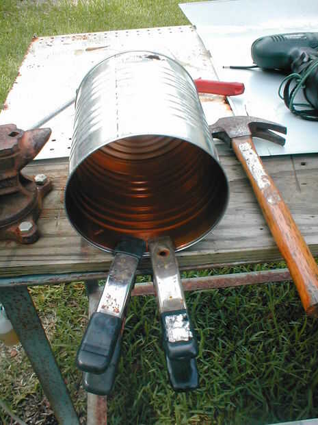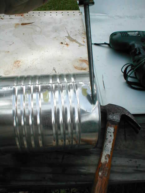 Ajustar el puede, salir de su martillo y un destornillador (supongo que un cincel trabajaría demasiado). Coloque el destornillador hacia la parte inferior de la lata sobre como lejos de la parte inferior como el conducto es alto. Comienza golpeando el destornillador en toda la circunferencia de la lata, haciendo un agujero lo suficientemente grande para tus tijeras para ir en.