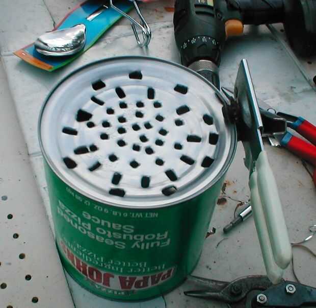 El inversor debe hacerse de algunos de la izquierda sobre conducto de chapa. trazar el contorno de la lata, luego agregar sobre un 3/4 en tapa a un lado. Cortar esta forma hacia fuera y la curva de la aleta. Tendrá que ser adijusted hasta que apenas cabe en la lata. Sólo se cortan apagado un poco a la vez con tus tijeras para chapa hasta que desliza en la parte inferior de la lata.