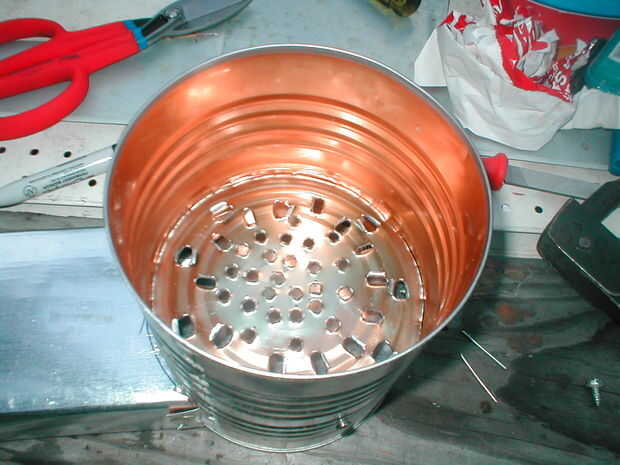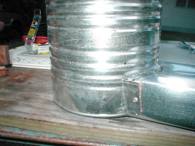 Primero tenemos que preparar un lugar para la parrilla. Sacar el taladro y perforar unos (3-4) alrededor de la circunferencia de la lata alrededor de la mitad una pulgada por encima de donde usted haga el orificio para el conducto. Tornillo en unos tornillos cortos, estos son para que la parrilla en.