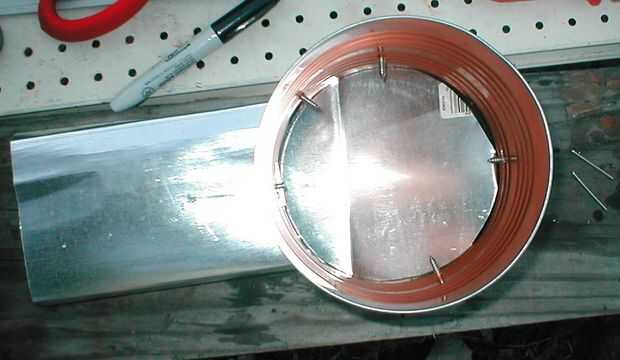 Ahora tenemos que modificar el conducto por lo que puede ser clavado o atornillado en el poder. Use el poder para marcar una línea de arco en el lado más ancho del conducto enfrente de la costura. Luego agregar dos líneas más perpendiculares a la arista de una aleta. (ver imagen abajo) Después de cortar a lo largo de estas líneas doble la lengüeta hacia fuera perpendicular al conducto.
