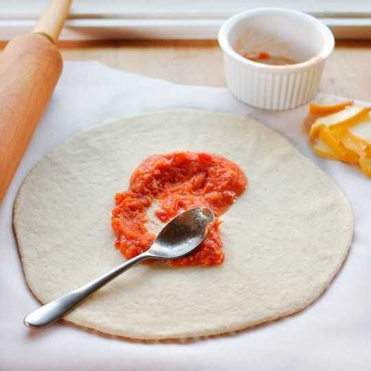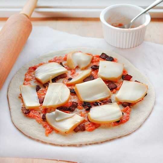 Sólo empezar a difundir la salsa desde el centro a los bordes y los otros ingredientes como verduras sobrantes, cebollas salteadas, pimientos en dados, champiñones salteados, cocidos bacon y peperoni como topping de la pizza de la pila.