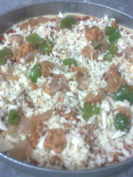Extender la salsa de pizza sobre la superficie y en él tikka del pollo y la cebolla en cubos. Disponer los quesos en la parte superior