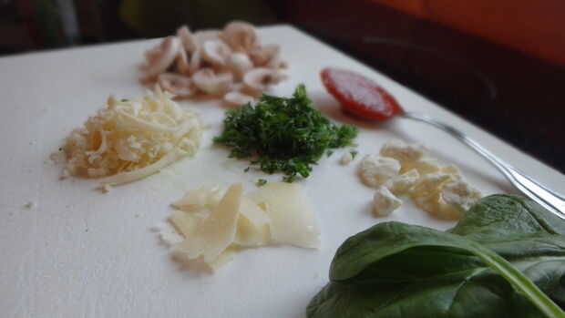-1/4 de taza de los siguientes quesos: queso Feta, parmesano y mozzarella (o cualquier queso que cosquillea su suposición)