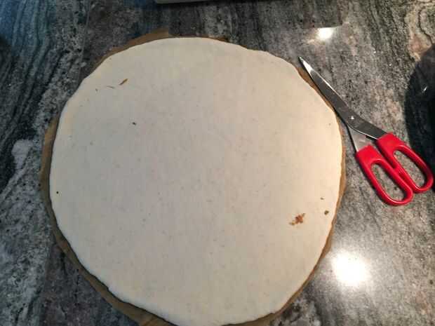 Con unas tijeras de cocina cortar todo el papel para hornear, dejando alrededor de 1-2inches alrededor de la masa enrollada hacia fuera.