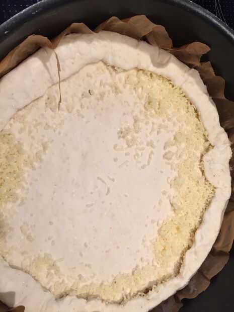 Espolvorear un poco de queso rallado a lo largo de la frontera. aleta en los bordes de la masa de sellado en el queso. Esto le dará a nuestro pie una corteza de queso maravillosa.