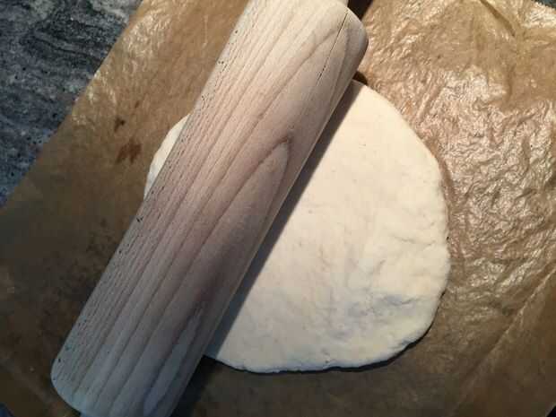 Tomar una placa para horno y espolvorear harina sobre él y luego estirar la masa hecha en un 1/2 pulgada circular hoja - ligeramente más grande que el molde para pizza destinados a ser utilizados.