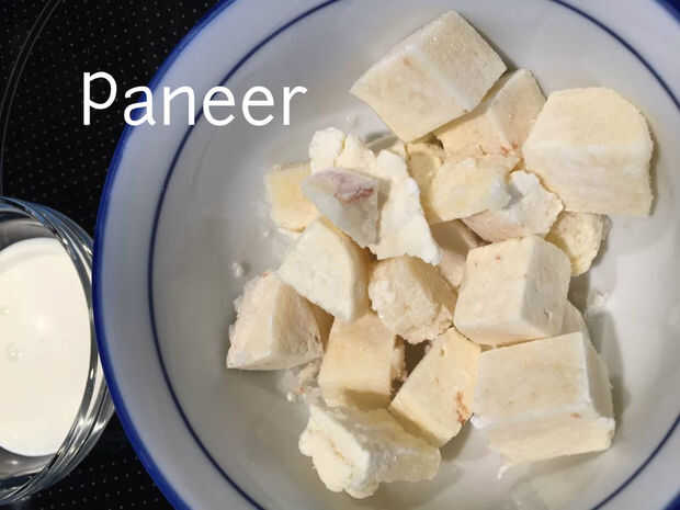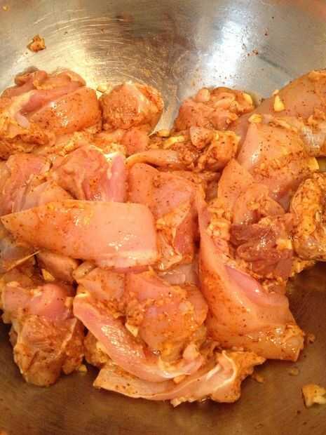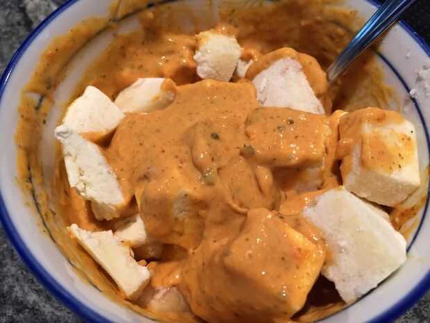 la gota la paneer(cottage cheese) de piezas de pollo a marinar en esta mezcla.
