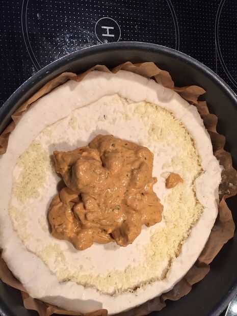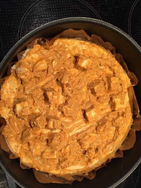 Una vez que la masa se ve bonito y esponjoso Esparza la mezcla con un cucharón en la superficie de la masa uniformemente. Los jugos del pollo dejará el líquido semi de salsa que hace más fácil de esparcir sobre la masa. Incase ha utilizado paneer y la mezcla parece seco y luego añadir alguna crema a la salsa