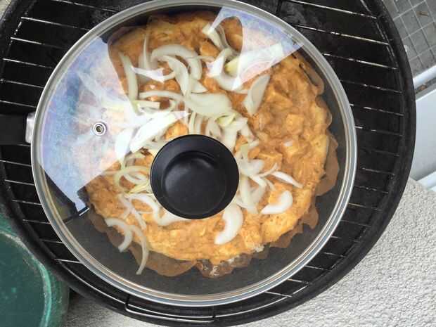 calentar las brasas de la parrilla del hervidor. Una vez que los carbones son de color rojos brillante y caliente Coloque la bandeja sobre la rejilla, retire la tapa de la cacerola y cierre la tapa de la parrilla.