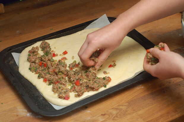 • Cubrir la masa con una dispersión uniforme del relleno de carne picada y espolvorear encima unos piñones si desea cocer en el horno durante 15 minutos o hasta dorado y completamente cocido.