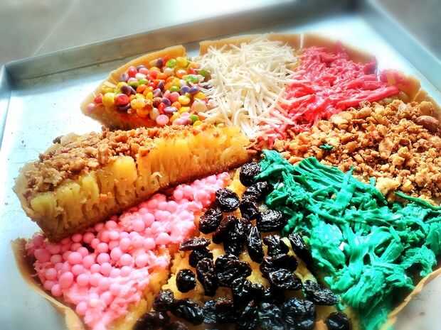 Pizza Van Java (Java Martabak con colorido en rodajas como Pizza de Chocolate)