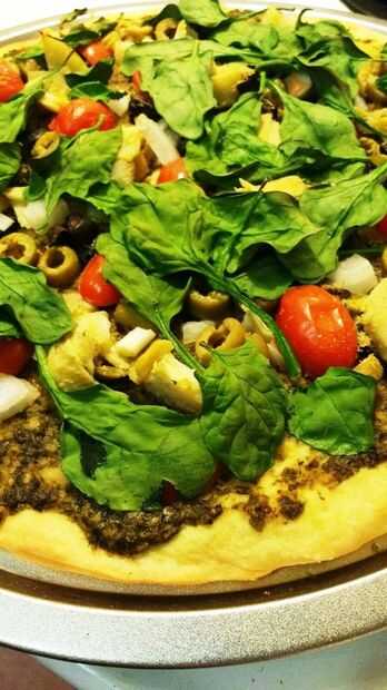 TIP: Mis pizzas como esta de la capa: salsa; abundante aderezos segundo (como pimientos verdes, cebollas, aceitunas y piña); ingredientes delicados tercero (como espinacas y tomates); y finalmente mi levadura nutricional o vegano parmesano espolvoreado por encima.