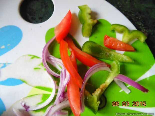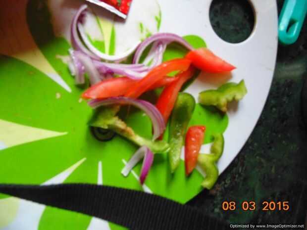 Verduras picadas en una manera especificada en la imagen. He utilizado cebolla, pimiento y tomate (eliminación de la sustancia jugosa).