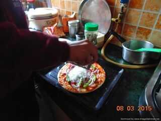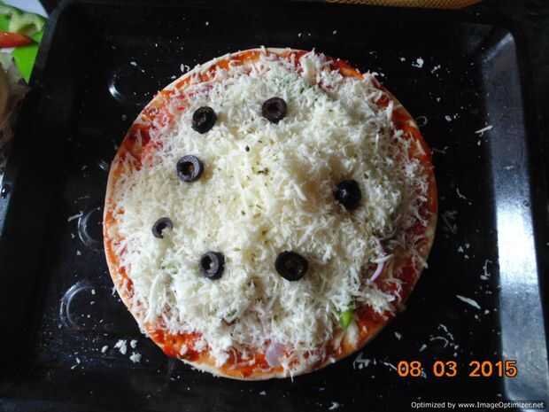 - Ahora tome la salsa y extenderlo sobre la base de Pizza como en la imagen. Tomar las verduras y dispersan, sobre la base de pizza.