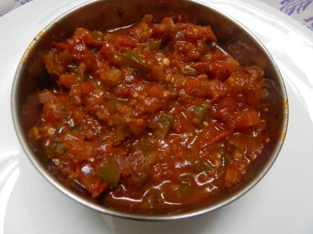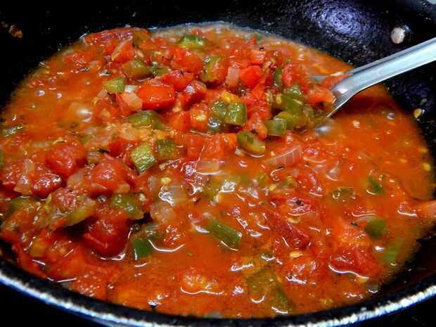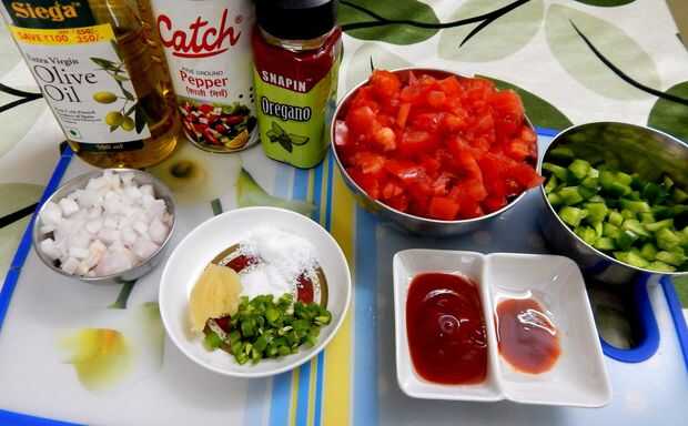 a una cacerola, agregar aceite de oliva, después agrega la cebolla, pasta de ajo y verde fríos... después de cebolla suda un poco, añadir el pimiento, saltear durante 1 minuto, añadir tomates, orégano, pimienta negra, sal. Cubra y cocine durante 10-15 minutos, retire la tapa, mezcla bien y finalmente añadir la salsa de tomate, salsa de guindilla roja, vinagre y azúcar.