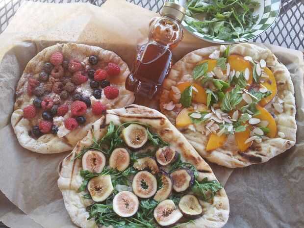 Este paso es una opción. Añadí albahaca y rodajas de almendras en la pizza de melocotón. Y algunos cacao en polvo sobre la pizza de berry.