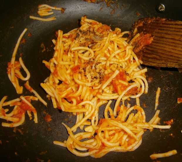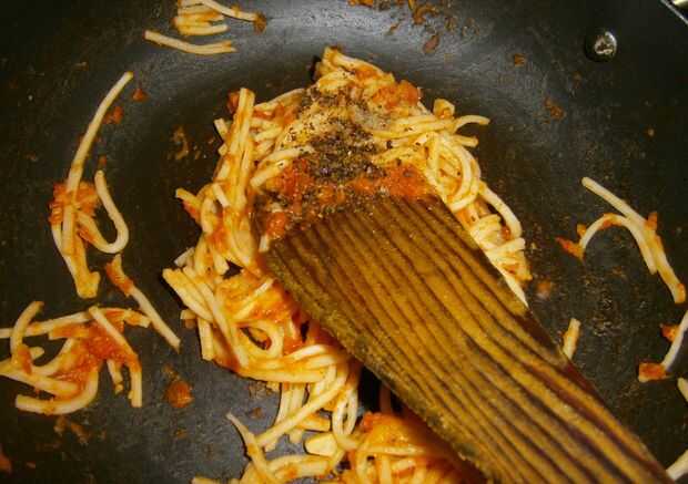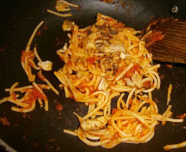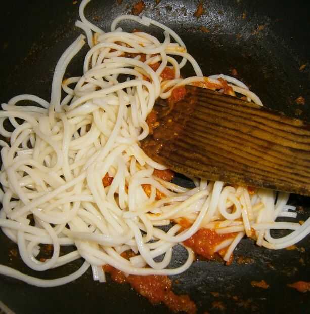 Añadir fideos hervidos y cocido pollo desmenuzado. Saltear bien.