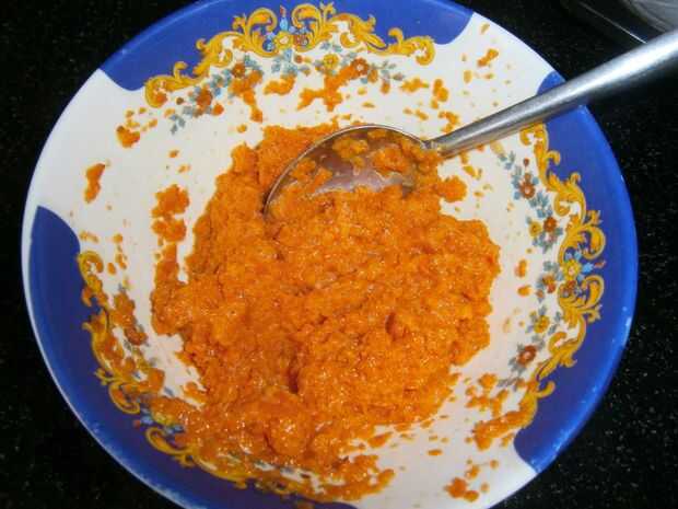 Tomar la zanahoria procesada y colar tanta agua (zumo de zanahoria) de las zanahorias que puedas utilizando un paño de muselina.