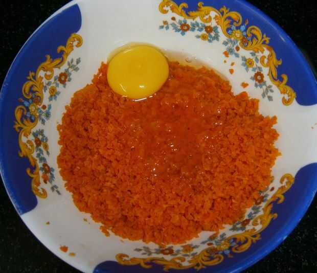 Coloque las zanahorias filtradas en un recipiente. Agregue el ajo y huevo hasta que estén bien mezclados.