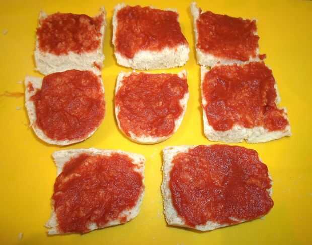 Ahora extender cada trozo de pan con alguna salsa de tomate, luego agregar una pizca de sal.