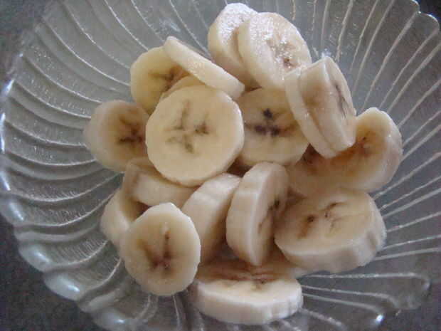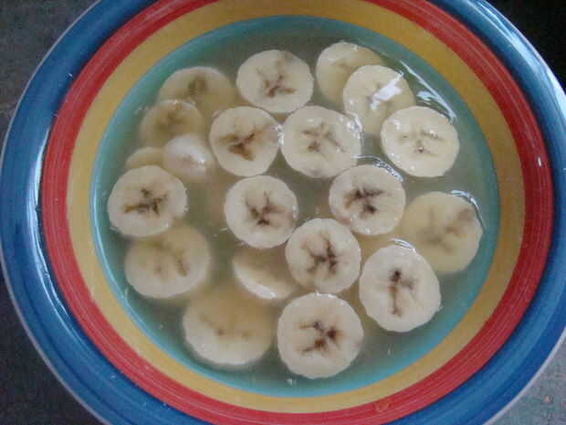 Las rebanadas de plátano se sumergen en el jugo de piña de los pedacitos de piña enlatada.