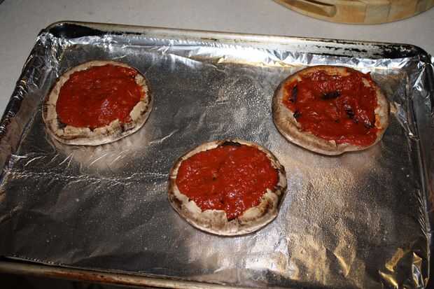 Cubrir cada tapa de seta con salsa.