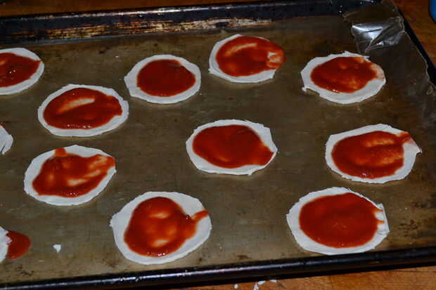 Poner una cuchara de t, o una cuchara t media (dependiendo del tamaño del tuyo pizzette) de la salsa en cada mini pizza.