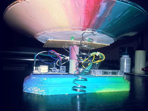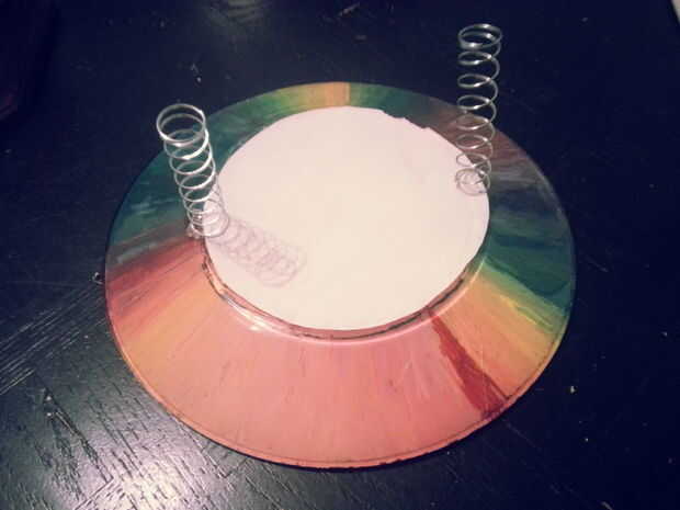 La incorporación de su placa, corte vitela al diámetro apropiado igual como la plataforma inferior a la superficie. Pegamento con seguridad muy fuerte sus resortes a lados opuestos de la plataforma inferior de la placa en el borde de la vitela. Esto permitirá su LED aparecer más atractivo como luces formando una cara triste versos recto-para arriba LED debajo de una superficie de alimentación.