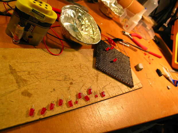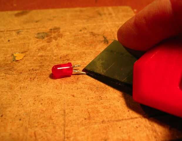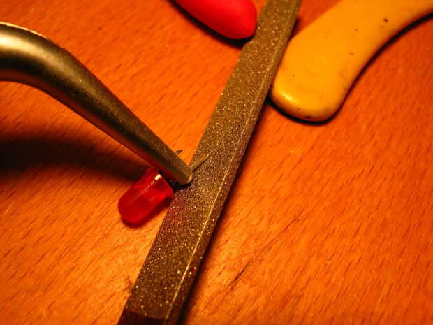 Ésta era probablemente la parte más difícil. Probé la laca y el pegamento y encontré super pegamento funcionado mejor. Hubiese funcionado mucho mejor había más tiempo para dejar secar durante la noche. El problema es pegamento funciona bien si usted presiona en él pero si dab justo en, como en las patas del LED, tarda mucho tiempo en secar. He probado usando un secador de pelo y creo que ayudó un poco. Tuve que volver atrás y poner dos o tres capas en algunas veces. También, inicialmente cruce la pierna entera luego lijar el fondo poco así que había metal desnudo pero luego encontró que era mejor sólo muy ligeramente, con la punta de la botella de pegamento, dab la pata del LED, luego deje que se seque.