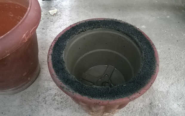 Para el primero de ellos, mezclar el concreto por lo que se trata de la consistencia de mantequilla de maní. El segundo de ellos debe ser más húmedo, casi como un líquido espeso (véase el cuadro arriba) pero no vamos a usar mucho de eso. Vamos a utilizar la última de ellas en primer lugar y verterla en la olla. Iniciar la rotación a maceta circular y hacia los lados hasta los reches de mezcla cada pulgada de la parte interior superficie como una capa. (véase el cuadro arriba). Hacemos esto para asegurar que cada detalle del complejo de culturas va a ser visible en una nueva.